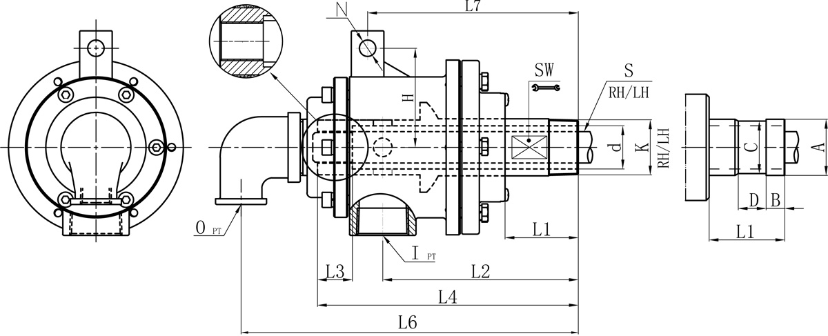 | Model | K | I | O | S1 | d | L1 | L2 | L3 | L4 | L6 | L7 | N | H | SW | 法蘭式外管尺寸對照表 | |||